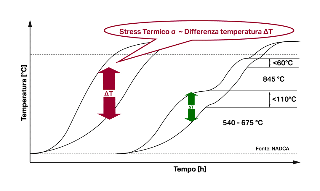 Più bassa è la differenza di temperatura ΔT tra cuore e superficie, minore sarà lo stress termico e la conseguente deformazione che si genera.